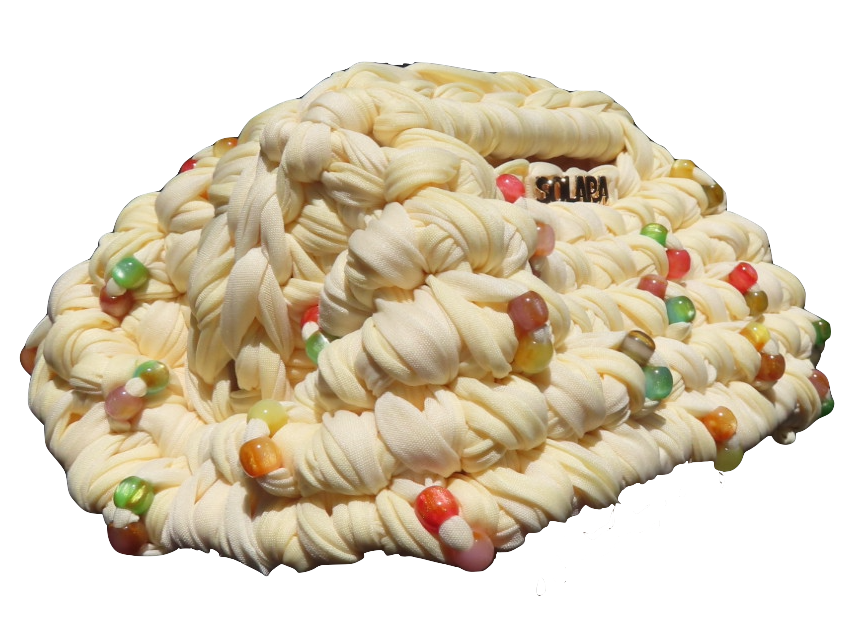 Hand-crocheted from three rows of butter and off-white yarn, finished with multi-coloured bead detailing and a gold SOLARA logo.