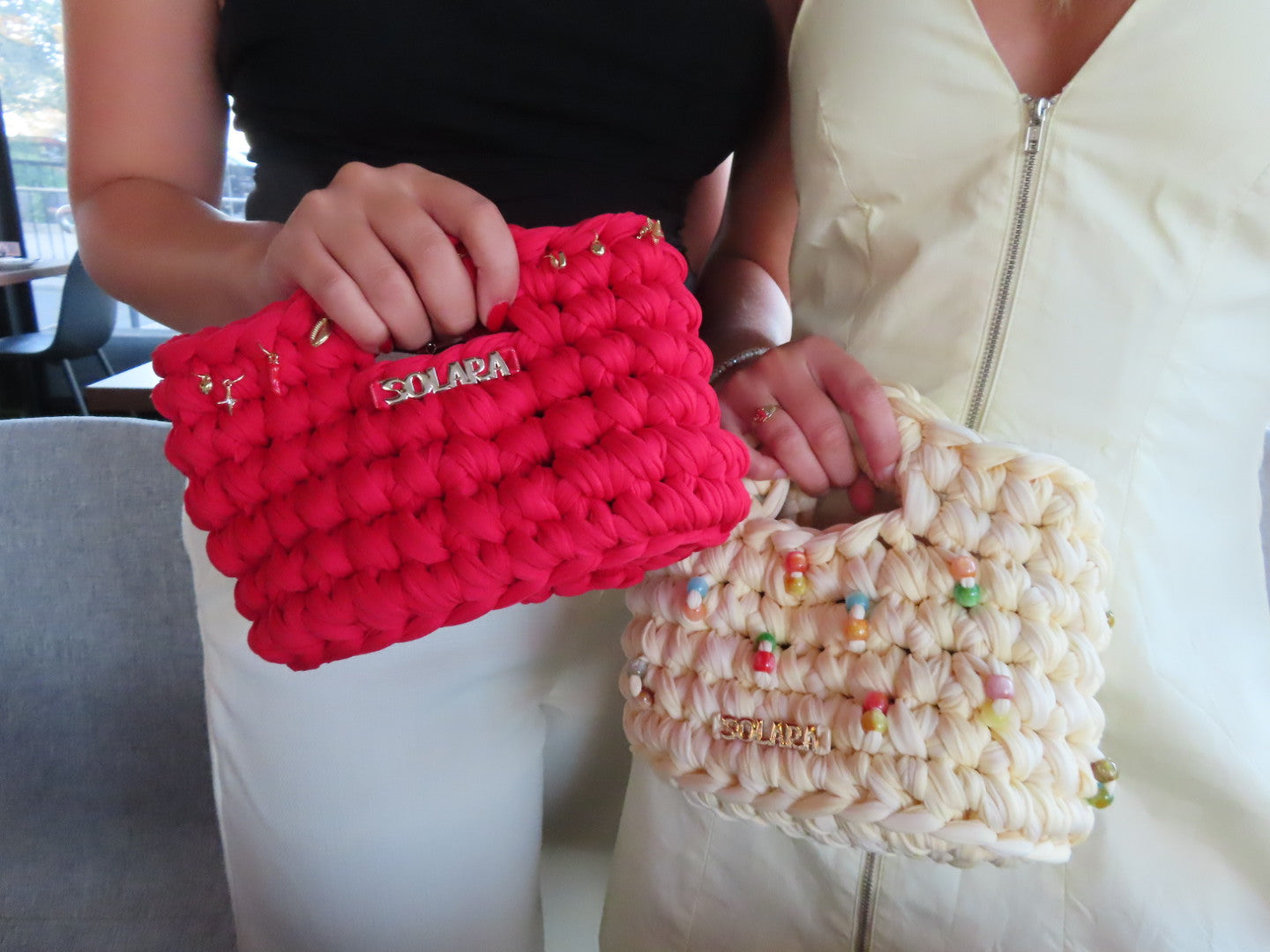 Crafted from three interwoven yarns — two in a soft butter tone and one in off-white — creating subtle depth and texture. Finished with multicoloured bead detailing and accented with a gold SOLARA logo, placed at the lower centre of the bag.